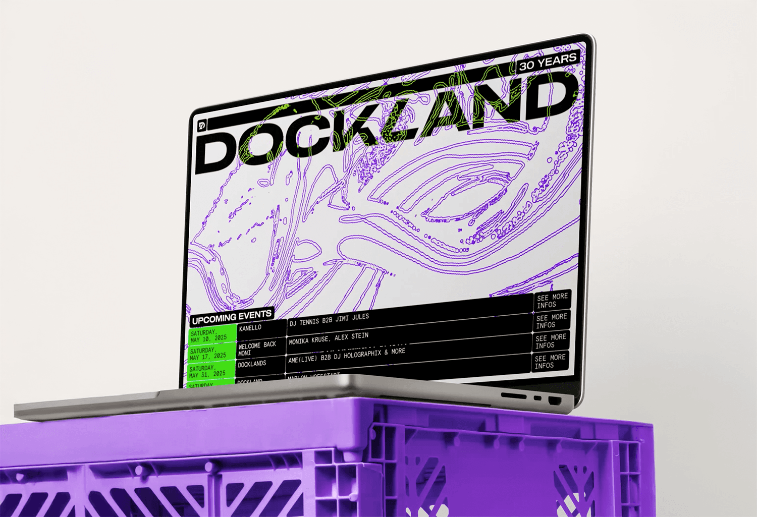 Dockland is an open-air venue in Münster where electronic music, culture, and cutting-edge audiovisual experiences converge. We created a modular identity that seamlessly connects the energy of the music to the unique atmosphere of the space.